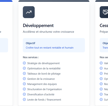 PM Développement vous accompagne à chaque étape de la vie de votre entreprise pour développer votre rentabilité et votre profitabilité, tout en plaçant l'humain au cœur de votre stratégie.