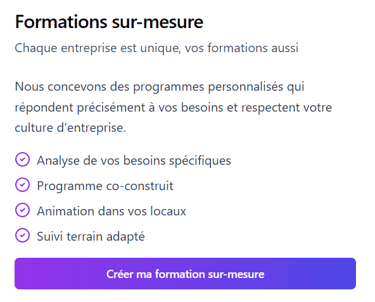 Vos besoins sont variés, de ce fait nous mettons en place des formations sur mesure adaptées à ceux-ci et non l'inverse